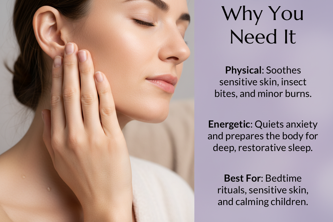 The Ritual: Massage into the temples, neck, and feet before bed to invite deep sleep. Excellent as a daily face oil for sensitive skin or applied to insect bites and minor burns to speed healing.