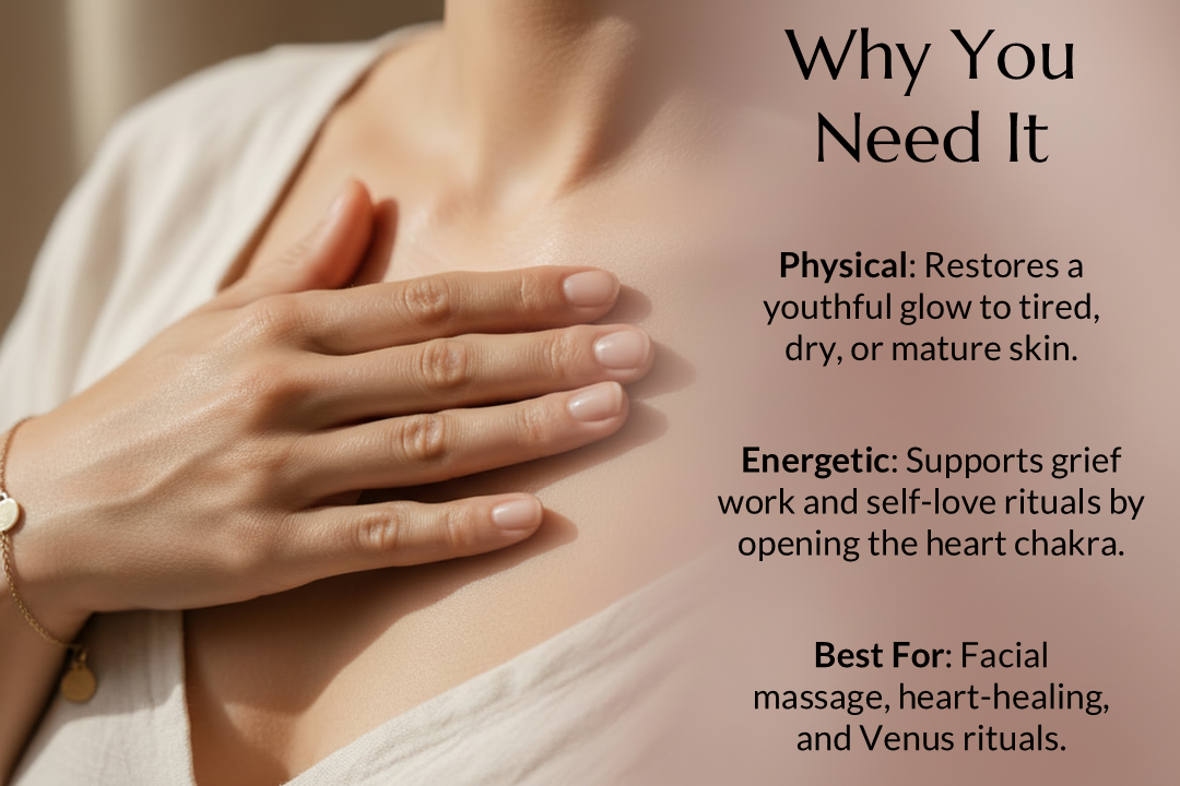 The Ritual: Apply 3-4 drops to the face and décolletage after cleansing. As you massage it in, visualize the armor around your heart softening. Perfect for Venus returns!