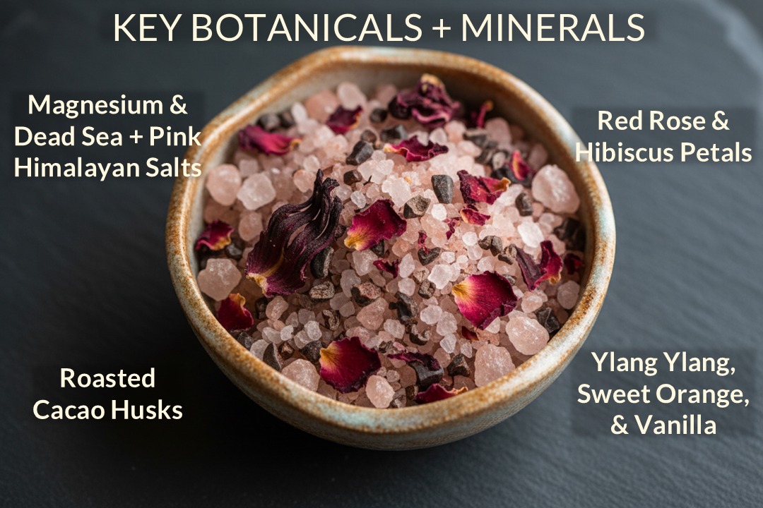 - The Botanicals: Red Rose petals, Hibiscus, and roasted Cacao husks (an aromatic heart‑opener that smells like rich, earthy chocolate).